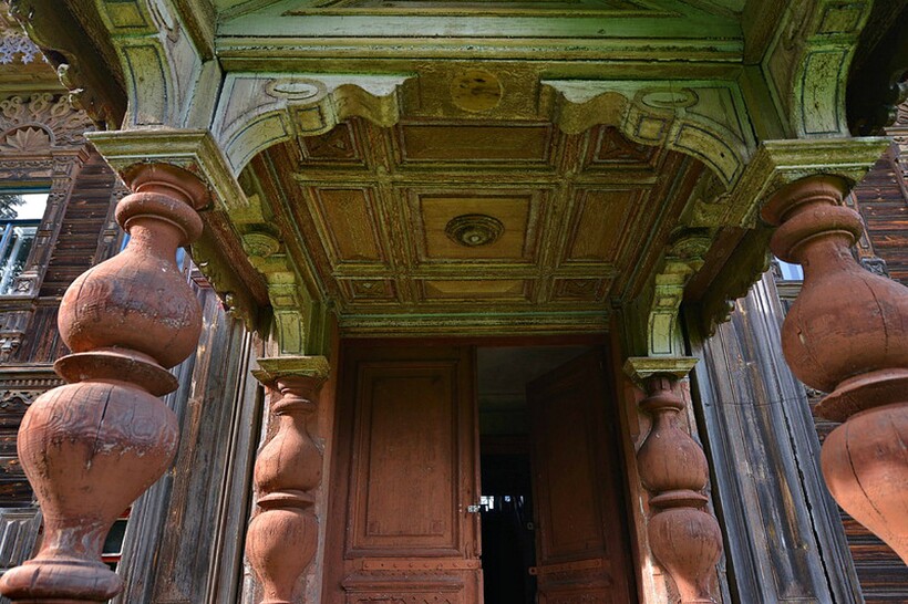 На первый взгляд, внешний вид дома Поляшова кажется немного деревенским, но его отделка фасада демонстрирует влияние городского дизайна в деталях, таких как оконные обрамления в стиле барокко.