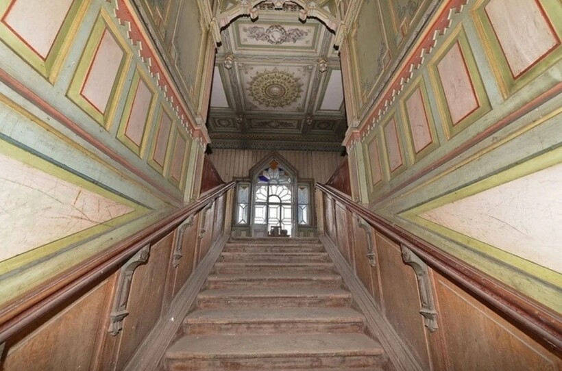 Зато в интерьере автор Поляшов отступил от неоклассики в пользу современной стилистики: в центре стояла огромная лестница, а по краям были рассредоточены комнаты.
