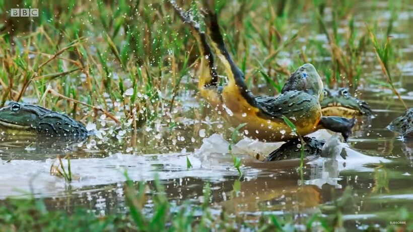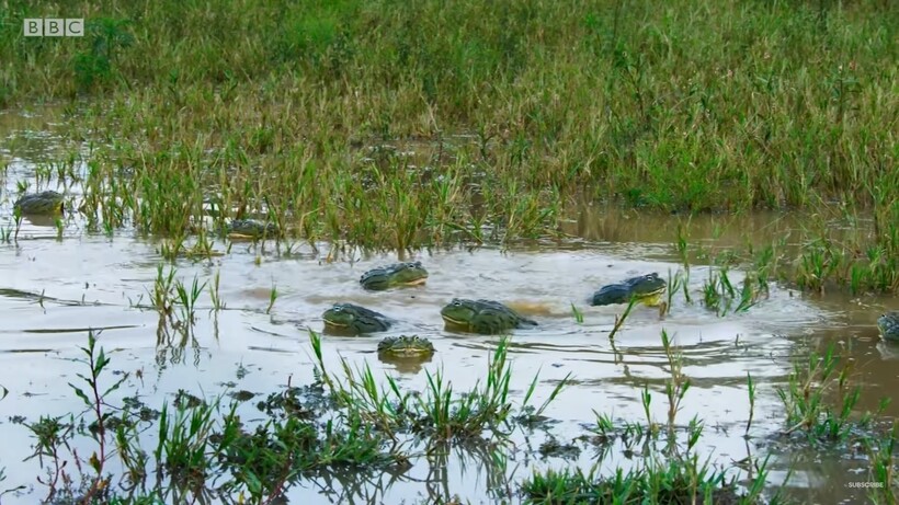 Кроме того, во время размножения у гигантских лягушек принято устраивать эпичные бои за право обладания самкой. Со стороны такое зрелище захватывает дух. Самцы хватают своих соперников за лапы и подкидывают в воздух подальше от центра водоема, где их ожидают дамы. Обычно такие состязания есть шанс увидеть в сезон дождей, когда вода в лужах поднимается до уровня 100 миллиметров и достигает благоприятной температуры. Захват тела соперника лягушка производит за счет выступов нижней челюсти. Лишь самые активные и опытные самцы способны достичь центра, где сразу прилипают к спине самки. Боевые соревнования за даму сердца случаются лишь пару дней в году. Их итогом становится откладывание большого числа яиц. Впрочем, из 4000 икринок дорасти до половозрелого возраста удается только трети. Остальные малыши неизбежно становятся добычей своих же прожорливых сородичей. Только через 3 года миниатюрный головастик становится полноценным взрослым.