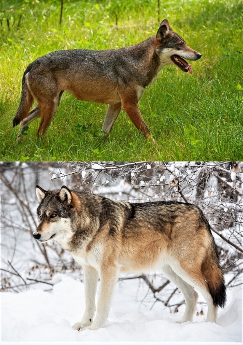 Собаки породы хаски считаются крупными животными, но рядом с волком они кажутся малышами.