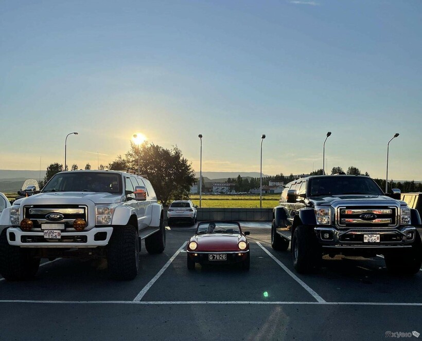 Triumph Spitfire 1977 года выпуска в окружении парочки внушительных авто Ford.
