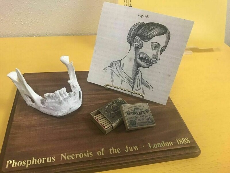 Условия работы были кошмарными: на заводах трудились по 14 часов, помещения не проветривались, и сотрудники постоянно дышали парами белого фосфора. Их всех неминуемо ждало одно ― отравление, которое заканчивалось физическим увечьем. Все начиналось с зубной боли, затем отекала десна, начинали выпадать зубы, появлялись нагноения. И, как результат, некроз челюсти, из-за чего челюсть приходилось удалять. Это заболевание получило название «фосфорная челюсть», и оно долгое время считалось профессиональным заболеванием работников спичечных фабрик.