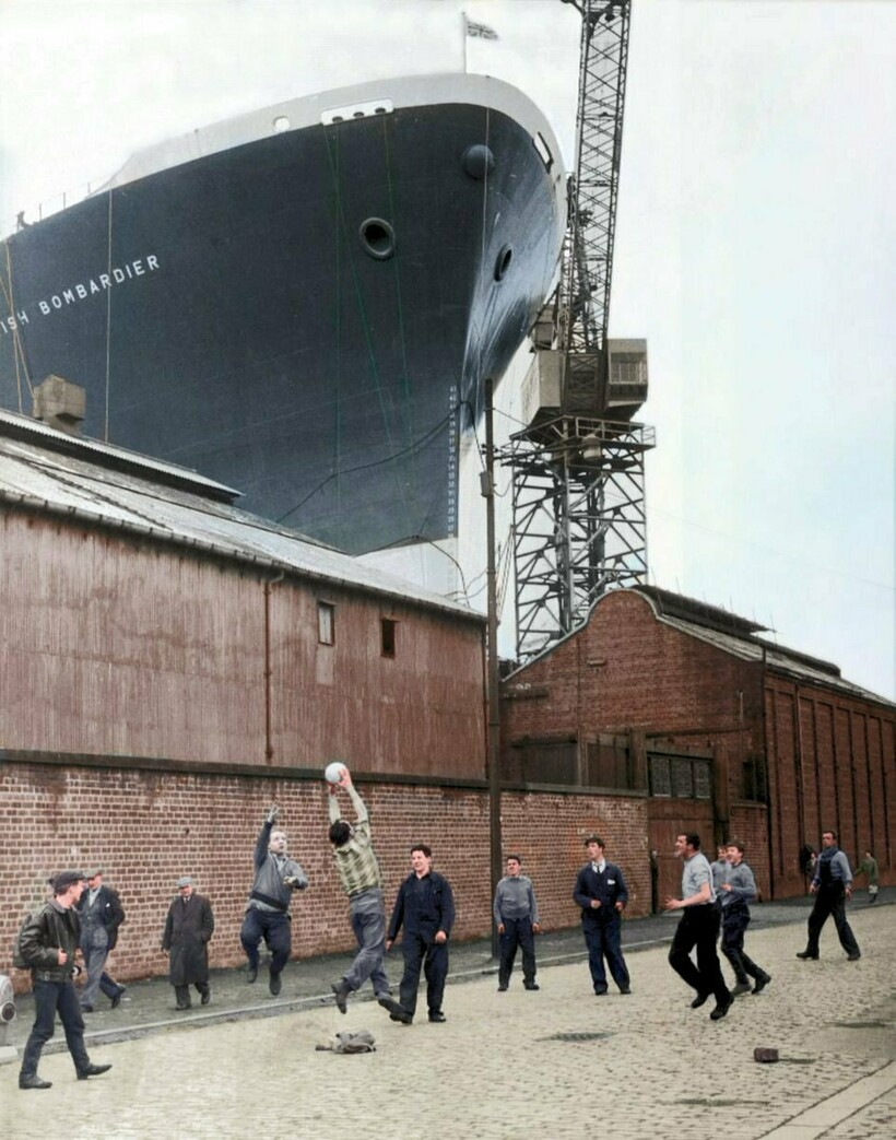 Металлический исполин возвышается над ангарами, возле которых рабочие играют с мячом. Снимок второй половины 20 века.