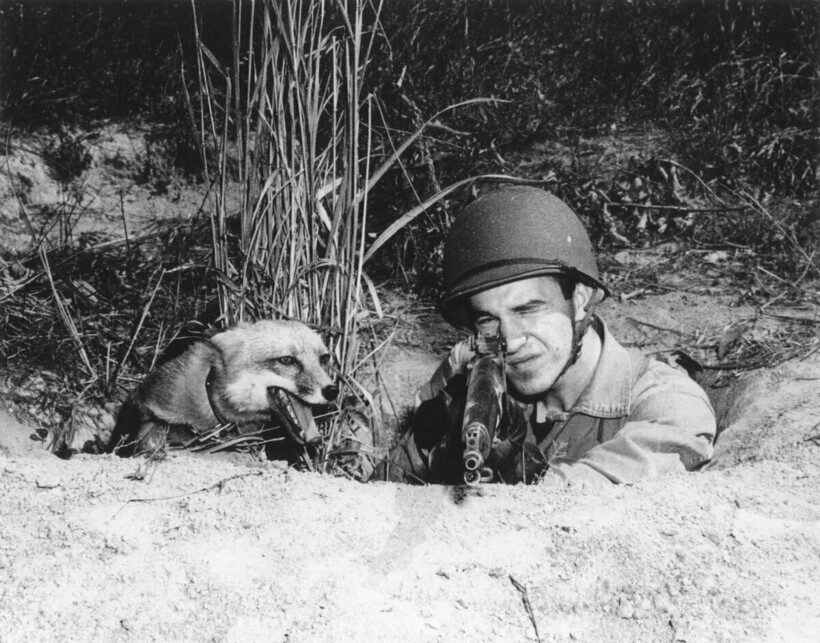 Этот солдат из армии США на все военные учения ходил в сопровождении своего лиса. Пехотинец был запечатлен с питомцем во время Второй мировой.