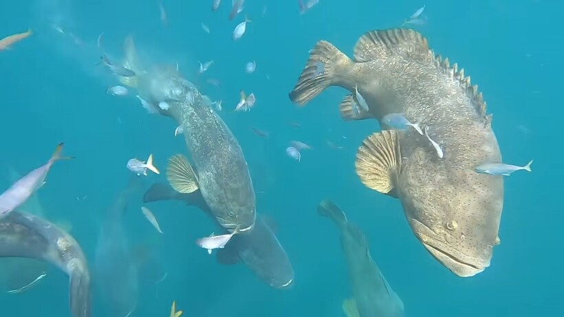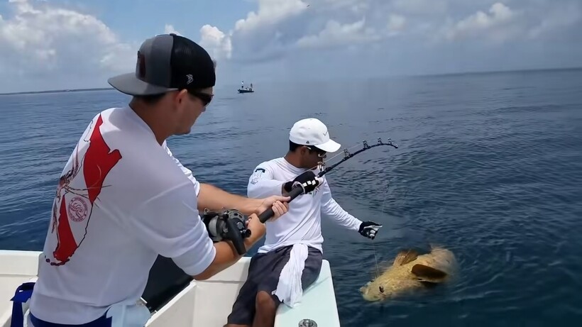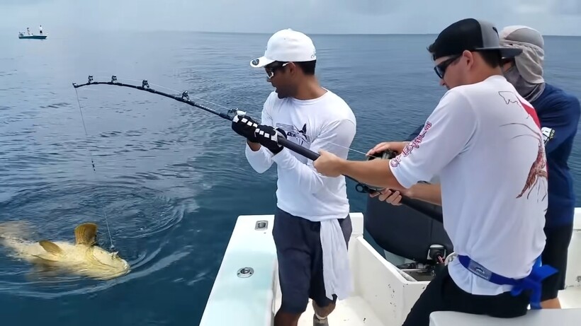 На этом видео блогер решил поиграть с гигантом и начал ловить его на огромную наживку. Под крики восторга к ним приплыл на такое лакомство дельфин. Это настолько удивило всю компанию, собравшуюся на яхте, что они завопили: «Дельфин!». Затем к ним присоединилась целая стая огромных неизвестных рыб. Но за ними молодежь уже не наблюдала. Одна из рыб схватилась за наживку и утащила почти всю удочку на глубину.