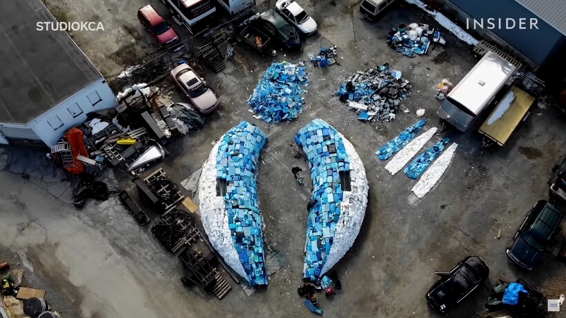 Пара творцов отправилась на побережье, где волны прибивают горы мусора, выброшенного в океан. Дизайнерам и группе волонтеров потребовалось 4 месяца, чтобы собрать 5 тонн мусора, и это еще не все, как сказал Джейсон. Затем люди отобрали пластик синих и белых оттенков для своей скульптуры. Чтобы не засорять городской канал, каждая часть этого огромного пазла была тщательно очищена.