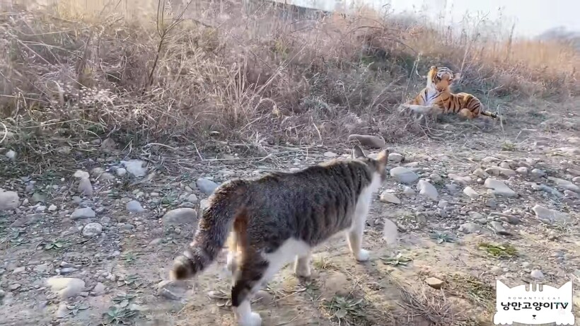 В какой-то момент мужчина говорит ей, что за поворотом ее ждет новый друг. Он явно хочет увидеть эту встречу, как эта женщина из другого ролика, которая разыграла своих питомцев. И тут наступает другая часть видео, которая называется «Скандал». Кошка видит вдали игрушечного тигра и пугается. Дальше Содам замирает и пристально следит за плюшевым зверем. Глупышка не понимает, что он ненастоящий, и всерьез боится его, а мужчина в этот момент общается с ней. Он говорит ей: «Содам, это большая кошка!» И кошка, будто испугавшись еще сильнее, начинает рычать на игрушку. В этот момент вся веселость, с которой она бежала на прогулку, испарилась. Кошка долго думает, что делать, и в итоге со страхом убегает.