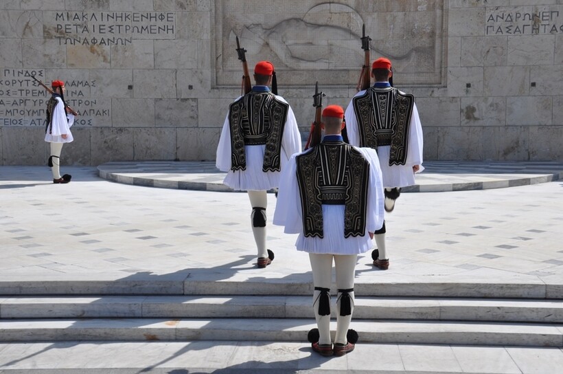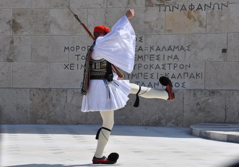 Десятки туристов собираются у здания парламента воскресным утром. И им не интересная политика или верхушка греческой власти. Их занимают охранники, а вернее гвардейцы элитного военного подразделения. Ровно в 11 часов они производят смену караула в манере, далекой от нашего представления, когда солдаты в строгих мундирах чеканят шаг у стен Кремля. В Греции все намного экзотичнее.