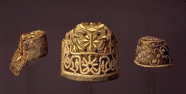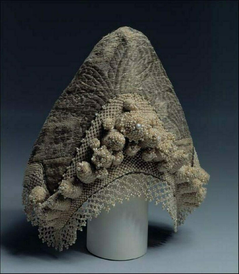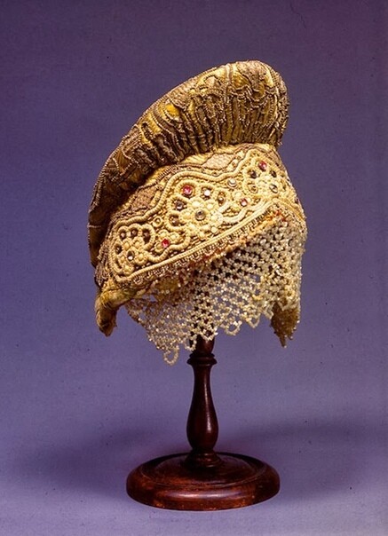Шапочку из золотых нитей с очельем из шелка замужние дамы носили под платком или другим головным убором. Кружевная основа волосника прибирала волосы, не давая им спутаться.