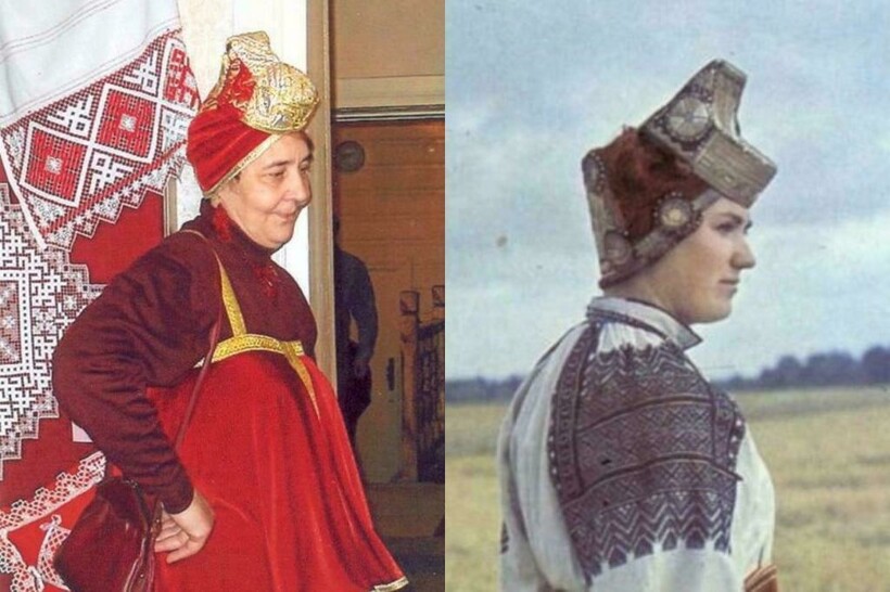 Этот праздничный убор — модификация рогатой кики. В XIV веке женщины носили производные от нее в виде копыта, котелка или еще чего-нибудь.