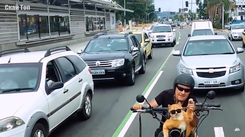 На этом видео показан настоящий кот-байкер, он смирно сидит на мотоцикле, пока владелец гонит по трассе. У пушистого даже есть защитные очки. Глядя на довольную мордочку кота и его неестественную позу, можно предположить, что он игрушечный. В какой-то момент мужчина-байкер даже поднимает лапу своего друга, и это тоже вызывает сомнения. Лучшие фото с кошками можно посмотреть здесь.