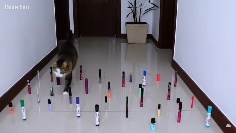 Кошки — грациозные и ловкие животные, и этот эксперимент доказывает это. Хозяева решили проверить своего питомца и расставили баночки с косметикой и маркеры на пути пушистика. На видео кошка с легкостью преодолевает препятствия, она идет так, будто их вообще нет на ее пути. Удивительно, животное не задело ни одного тюбика, хотя стояли они очень неустойчиво. Собака же в такой ситуации выглядит как слон в посудной лавке и сбивает все на своем пути. А в предыдущем материале мы смотрели на кошек, которые уснули в самых интересных местах.