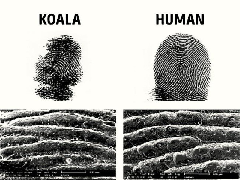Если посмотреть на отпечатки пальцев человека и коалы, то сразу сложно определить, где какие. Даже следователи, расследуя преступления в зоне обитания этих животных, могут ошибиться.
