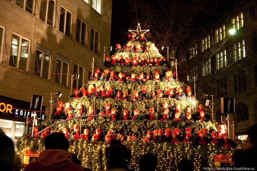 Как же можно обойтись без праздничного дерева? Однако сегодня уже никого не удивить обычной красиво украшенной елкой. Потому креативщики Цюриха пошли дальше — они сделали поющую ель. Представители хора исполняют рождественские песни, создавая этим праздничное настроение для горожан. Кстати, о том, как нелепо люди могут встречать зимние праздники, мы писали ранее.
