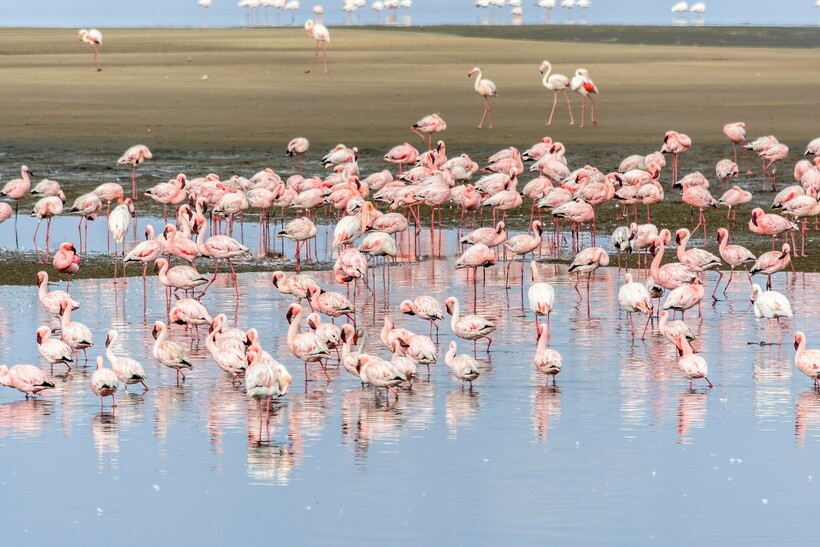 Розовых фламинго можно сфотографировать прямо из центра города рано утром, когда они все собираются на приливных равнинах.