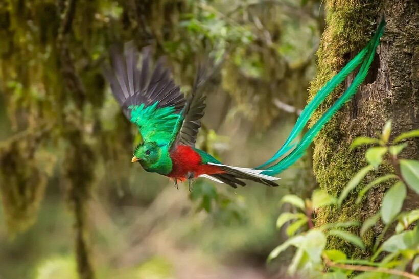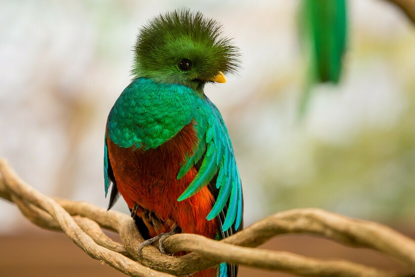 Квезаль, или кетцаль, как его еще называют, водится в Латинской Америке от Мексики до Панамы, выбирая горные прохладные леса. Древние майя и ацтеки считали птиц священными и думали, что в них есть часть божьей силы. По этой причине перья квезаля часто использовались для многих ритуалов и обрядов. Правда, добывать перья нужно было аккуратно и уважительно к птице: майя ловили кетцаля, извинялись за причинение ущерба, брали пару перьев с хвоста и отпускали пташку на волю.