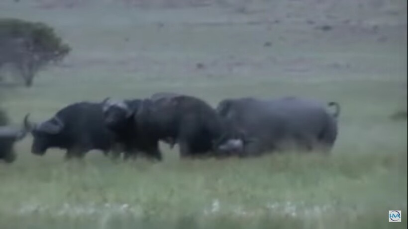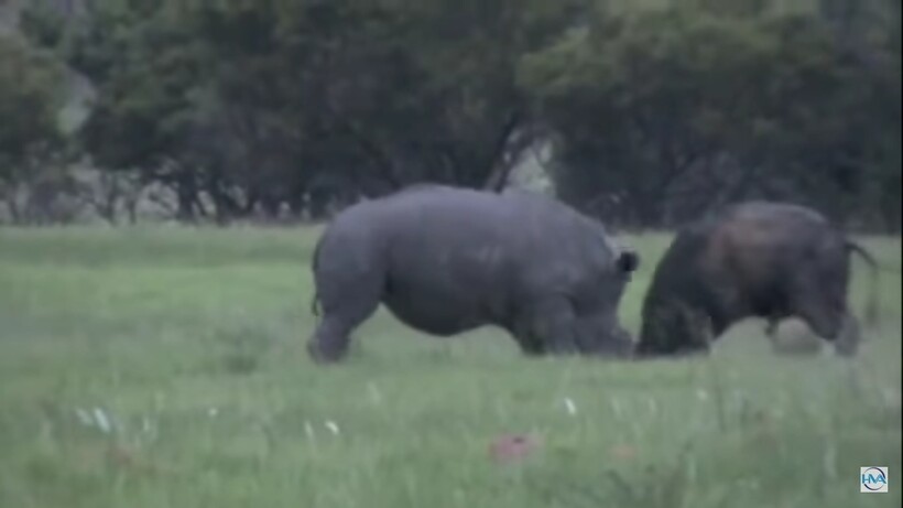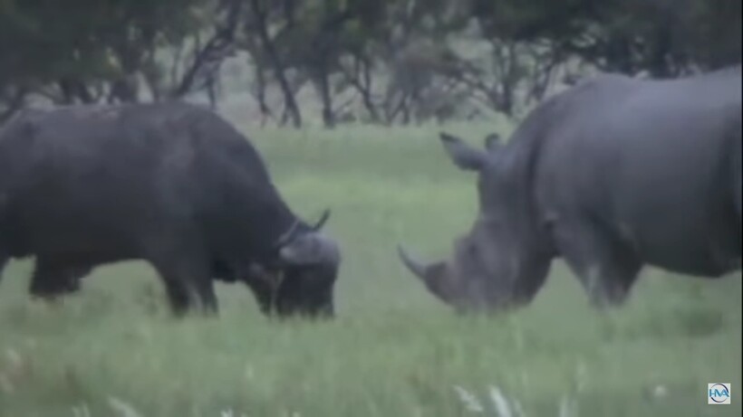 Затем, явно шокированный смелостью противника, носорог начинает отступать, когда другие члены стада буйволов начинают приближаться к нему. Это похоже на то, как студенты-первокурсники спешат на помощь своему другу, над которым издевается старшеклассник. К счастью, ни один из противников не пострадал в ходе почти четырехминутной потасовки.