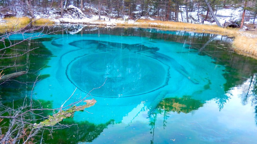 Когда в алтайских лесах опадают последние листья, а воздух становится прозрачнее и прохладнее, среди деревьев хорошо просматривается река Катунь. Река потихоньку мелеет, обнажая местами свое дно. В конце осени становится возможным переходить по руслу реки с одного острова на другой. Осенью вода отходит в глубокие ямы и земные разломы, оголяя острова и формируя озера. Чем меньше дождей и ниже уровень воды в реке — тем больше появится озер. В октябре их бывает два, а уже в ноябре может появиться третье.