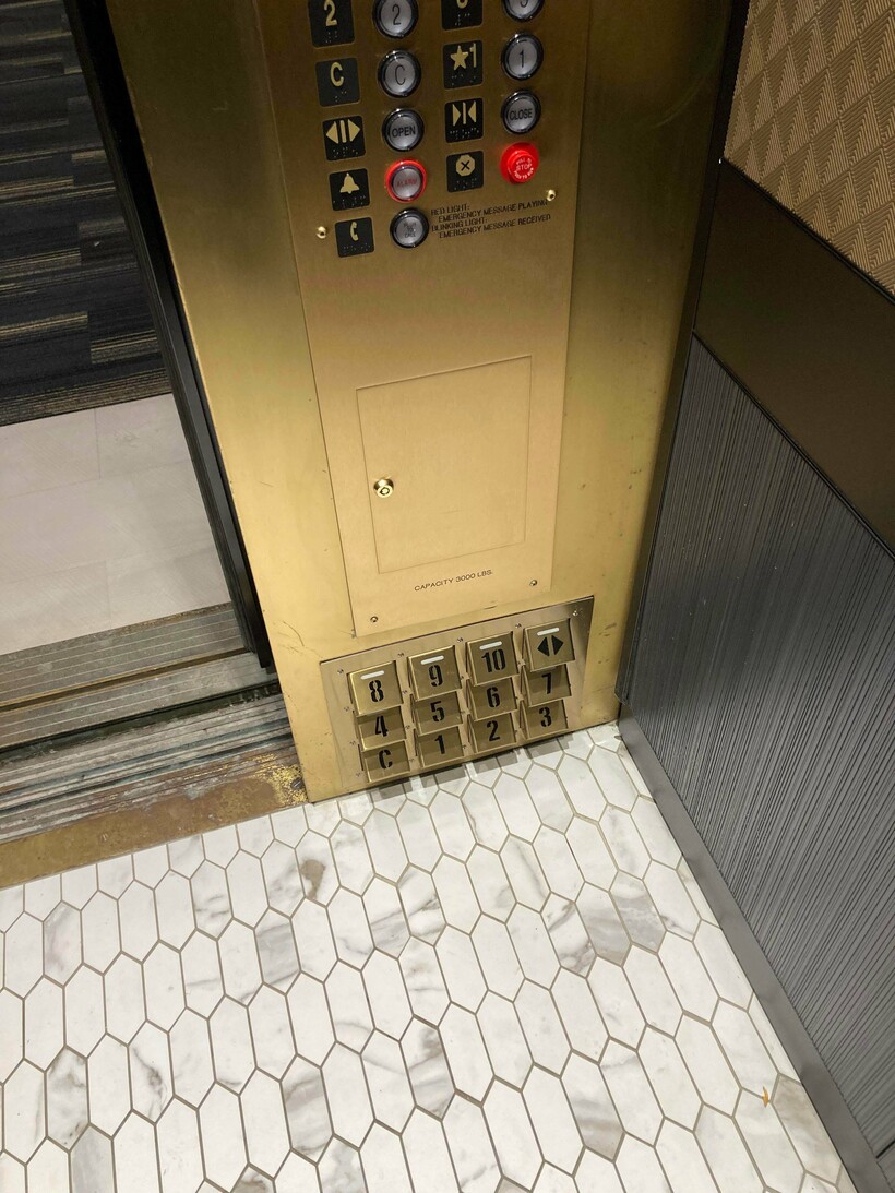 В нем сделаны кнопки этажей, которые можно нажать ногой.