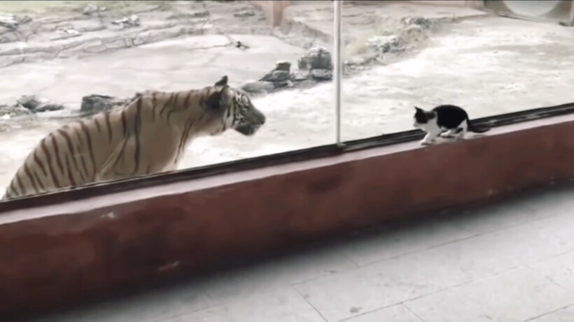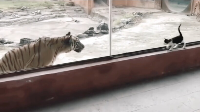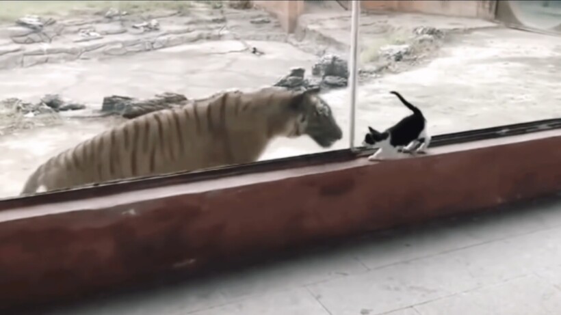 В видео, опубликованном на YouTube, видно как черно-белый котенок заходит в зоопарк и с любопытством приближается к вольеру с тиграми. Он так наивно идет к хищнику, играясь по пути с чем-то. А тигр в это время уже навострил уши и внимательно следит за малышом. Видно, что он уже готов напасть на котенка даже через стекло. В какой-то момент малыш замечает огромного зверя, пугается и уже не так уверенно идет. Кульминацией становится его приближение к тигру, когда большое животное уже не выдерживает и бьет лапой по стеклу, а котенок резко отбегает от вольера. В этом видео детеныши впервые увидели взрослого тигра.