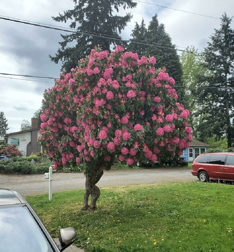 У цветущего рододендрона как будто две ноги вместо ствола, и он собирается куда-то бежать