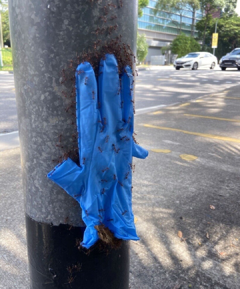 Муравьям зачем-то понадобилась перчатка, и они упорно тащат её по столбу