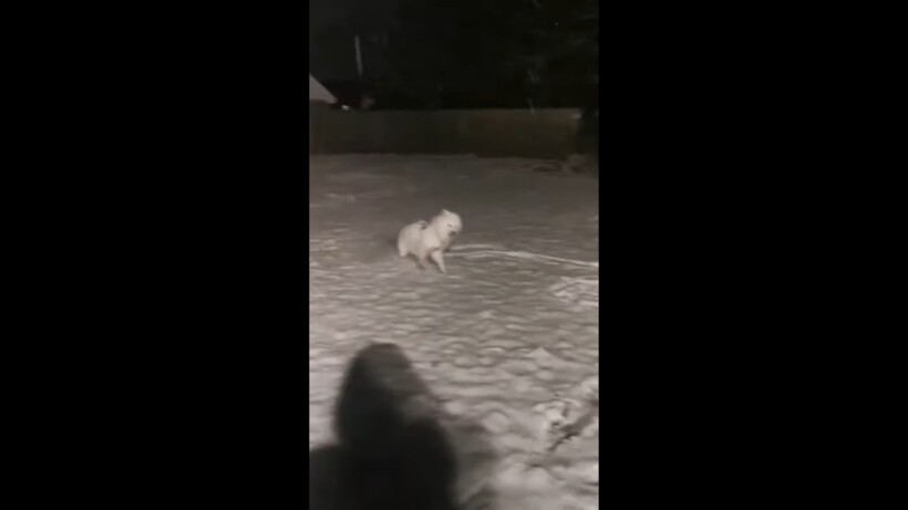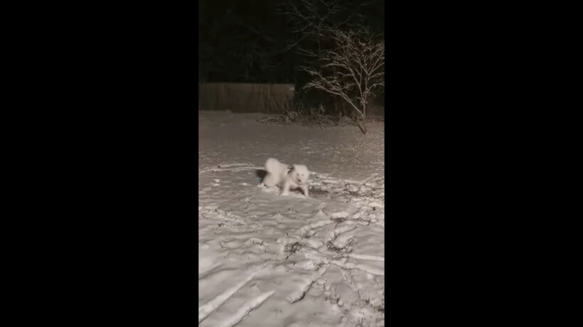 Снегу радуются не только люди, но и животные. Эта собака породы самоедская лайка еще никогда не видела снега в своей жизни. Ее мех белого цвета сам напоминает снег, и щенка случайно можно спутать с небольшим сугробом. Щенки всегда очень активные и игривые, поэтому им не нужны причины для того, чтобы веселиться и скакать от радости. Когда же на улице выпадает снег, их настроение поднимается еще больше.