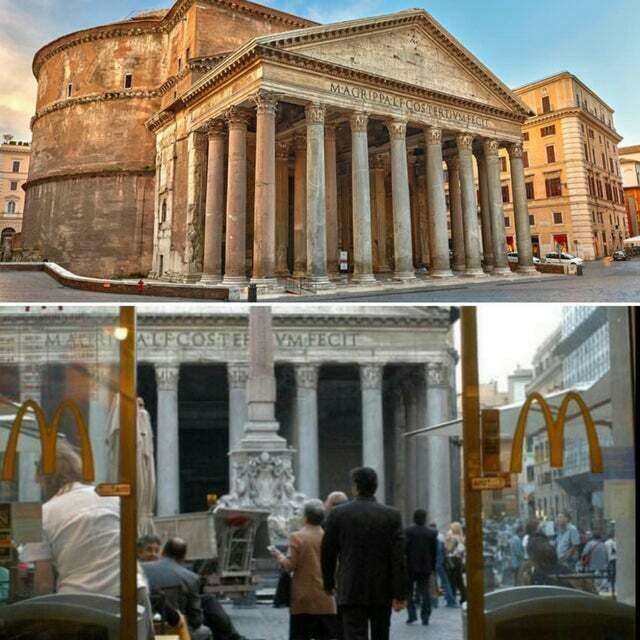 Пантеон — величественное здание, которое находится в Риме. Если вы вдруг проголодаетесь, рассматривая эту достопримечательность, у вас будет возможность заскочить в McDonald’s напротив.