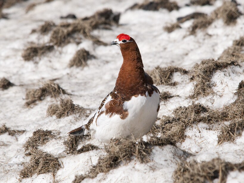 Самцы белой куропатки весной меняют оперение на шее и голове на темно-коричневое и становятся очень заметными среди других птиц. Когда самцы куропаток осматривают с возвышенностей свои гнездовья, они оглашают тундру то ли криком, то ли хохотом, то ли таким громким пением, от чего с непривычки можно испугаться. Пока самцы распевают на всю округу, их самки насиживают кладку из более чем 10 яиц.