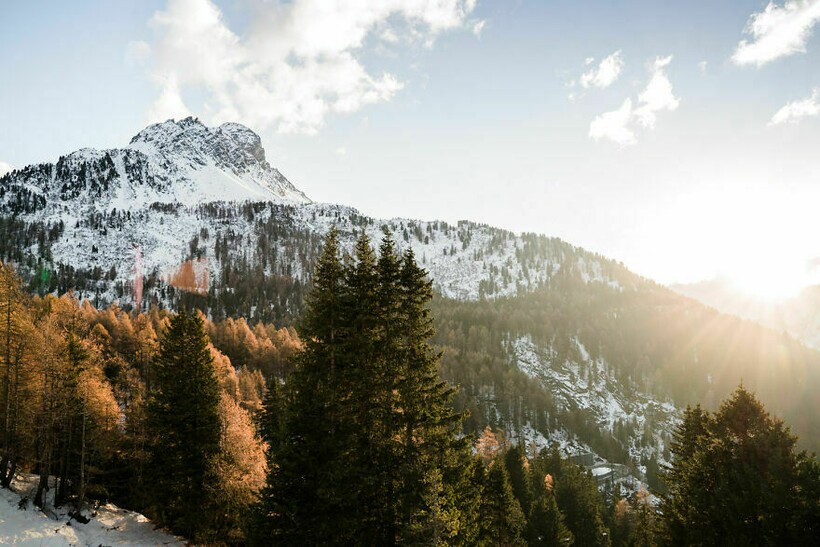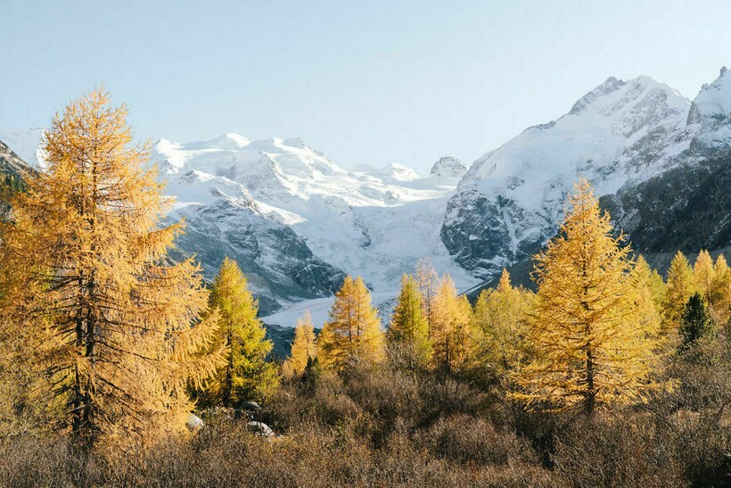 Бледные зимние горы вдалеке интересно смотрятся на фото с яркими осенними деревьями на переднем плане