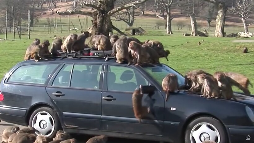 Путешествуя в страны, где много-много диких обезьян, стоит держать ухо востро: этим хвостатым проказницам достаточно пары минут, чтобы полностью распаковать ваш багаж, вынуть все вещи, открыть багажник автомобиля и даже снять колпаки с колес. Этот автомобиль стал подарком приматам в одном из зоопарков, но в дикой природе такие нападения обезьяньей оравы на машину случаются очень часто. Один из таких случаев мы показывали в этом материале.