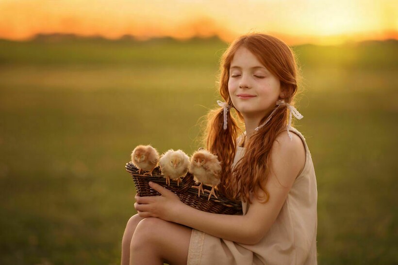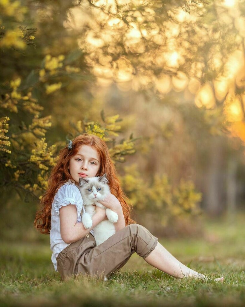 Фотограф по имени Мария Прессер живет в Аргентине, и она обожает фотографировать своих двух рыжеволосых дочек. Одна из её девочек безумно любит братьев наших меньших. «Когда она держит животное, она всегда кажется полной радости. Это вдохновило меня на то, чтобы сфотографировать как можно больше животных с ней», — рассказывает Мария. Так появилась целая серия фотографий двух очаровательных девочек с разными зверушками.
