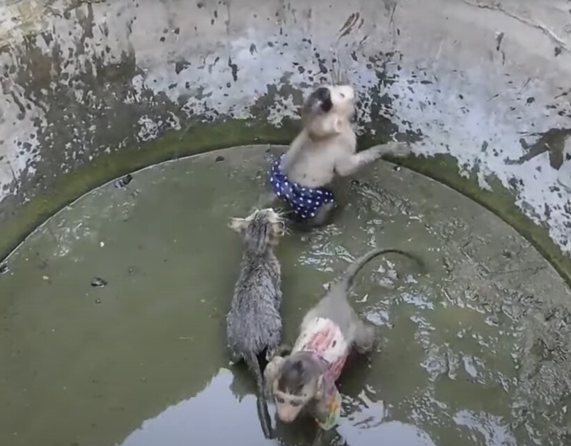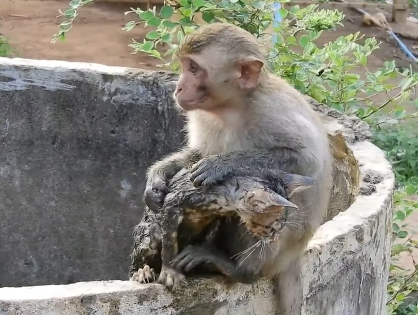 Поначалу она протягивала лапы обезьянкам, и одна из них старалась уцепиться за них, но ничего не выходило. В какой-то момент Мэри свесилась вниз, и одна из обезьянок по ее спине выбралась на свободу, за что тут же поплатилась — взрослой обезьяне что-то не понравилось, и она решила наказать малыша. В это время вторая взрослая обезьяна извлекла из колодца другого детеныша приматов и помчалась спасать первого от разъяренной подруги. Кажется, про котенка все забыли, но тот продолжал истошно кричать. В другой истории обезьянке понадобилась забота и она обрела ее со стороны собаки.