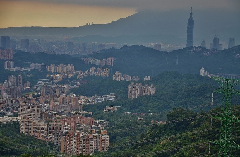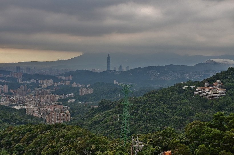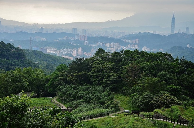С вершины горы открывается панорама огромного города с возвышающимся зданием Taipei-101.