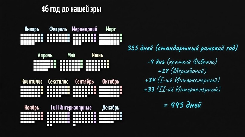 Древний Рим внес очень важный вклад в создание календаря в том виде, в каком мы его знаем сейчас. К счастью, не все их новшества остались в нашем пользовании. Начиная с зимнего периода без месяцев и заканчивая непредсказуемым високосным месяцем под названием Мерседоний — многие из этих изменений привели граждан в замешательство. Возможно, самой странной временной переменой был 445-дневный год.