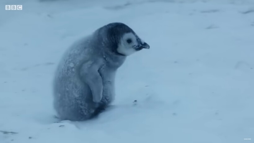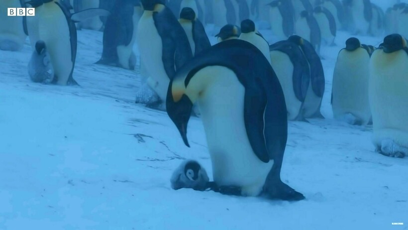Канал BBC Earth снимает цикл о жизни императорских пингвинов, и в этом сюжете авторы рассказывают, как птицы выживают в снежном буране. Метель уже добралась до колонии, и если в безоблачные дни единственной защитой птенца служит «меховое пальто», то во время ненастья при –40°С этого недостаточно. Он должен спрятаться в сумке своей матери или отца, чтобы они согрели малыша своими перьями и теплом. Если птенец потерялся среди сотен пингвинов, то кроме родителей ему никто не поможет — другие птицы заботятся только о своих собственных чадах. Мать пропавшего птенца тоже волнуется и кричит, зовя его, но ее крик уносится ветром.