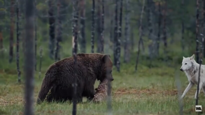 Это видео было снято в Йеллоустонском национальном парке. Стая волков преследовала стадо лосей, пока наконец не убила одного. Все это время за ними наблюдал гризли, чтобы затем приблизиться к волкам и просто забрать их добычу. Такое поведение называется клептопаразитизм — одно животное крадет ресурсы у другого. Судя по всему, медведь сообразил, что можно получить добычу, не прикладывая к этому почти никаких усилий. После погони и охоты волки слишком устают, чтобы сопротивляться или загонять нового лося. Вместо этого им приходится ждать, пока медведь наестся. С точки зрения гризли, свежая туша лося является источником большого количества жира и белка, что идеально подходит для подготовки к зимней спячке. Увидеть драки медведей и волков можно в нашем прошлом посте.