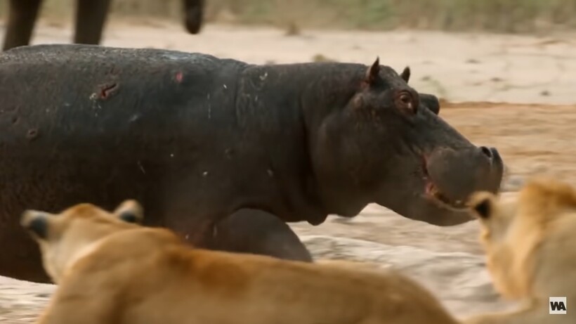 Бегемота могут обездвижить львы, крокодилы и им подобные. Гиппопотамы нечасто убивают друг друга в дикой природе. Чаще это происходит в неволе, где возникают территориальные споры. Львы иногда сталкиваются с гиппопотамами лицом к лицу в территориальных спорах, но это обычно приводит к смерти одной из сторон. При охоте на молодых бегемотов львы будут действовать сообща, приближаясь с противоположных берегов. Когда же они добьются успеха, поделятся своей добычей с прайдом. Известно, что в некоторых случаях бегемоты сами убивали королей зверей без всякой причины.