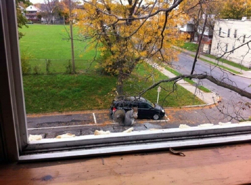 Подоконник, на котором сидит белка, почти незаметен, и создается иллюзия, будто зверек огромных размеров и находится прямо возле автомобиля.