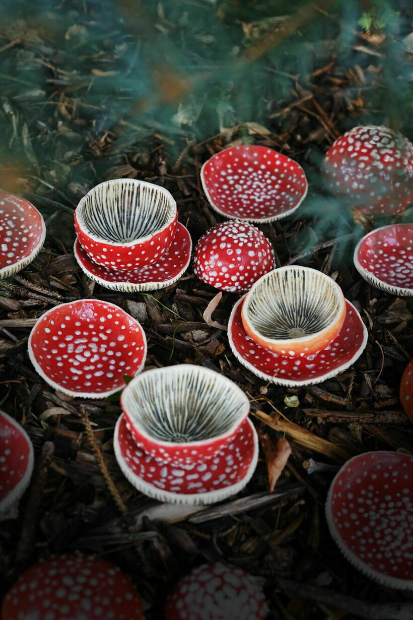 Чайный сервиз, напоминающий полянку ярких мухоморов