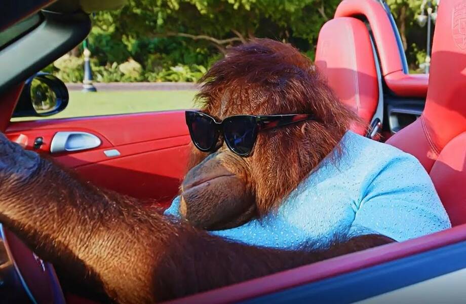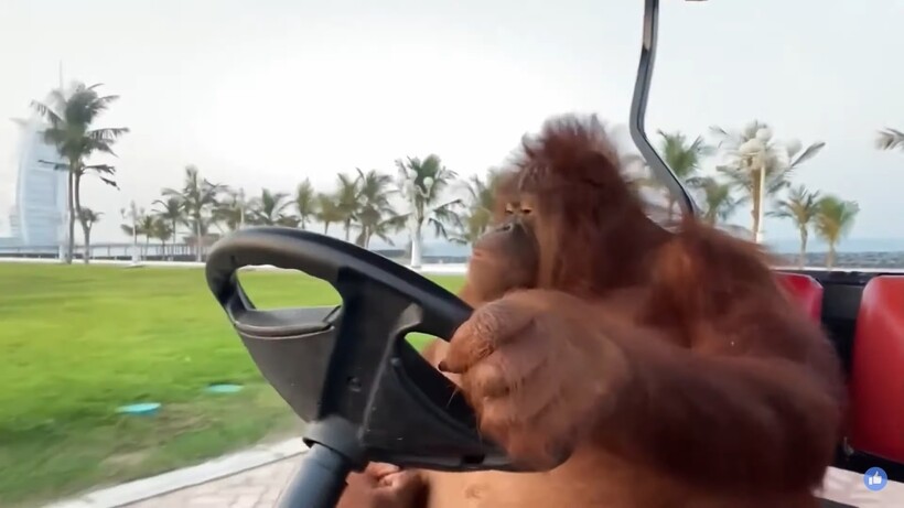 Да, это был настоящий орангутан, а не человек в костюме. Ее зовут Рэмбо, и она живет в Дубае в частном зверинце. К сожалению, нет информации, как она в него попала, угрожала ли ей опасность и насколько она далека от своих диких сородичей. Но то, что она близка по интеллектуальному развитию к человеку, видно невооруженным взглядом. В видеоролике ниже мы видим, как животное небрежно ведет гольф-кар, держась левой рукой за крышу, а правой за руль. Обезьяна может рыбачить, писать картины, играть на музыкальных инструментах. Конечно, все у нее получается, как у ребенка, и не очень понятно, нравится ли ей это все. Глядя на то, как она удит рыбу, в бессознательность ее действий уже трудно поверить. Орангутаны способны на многое, и недавно мы показывали, как обезьяна организовала массовый побег из заповедника.