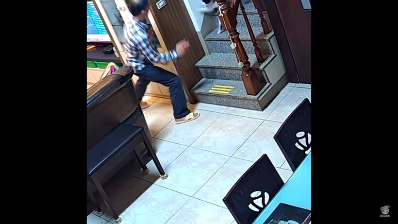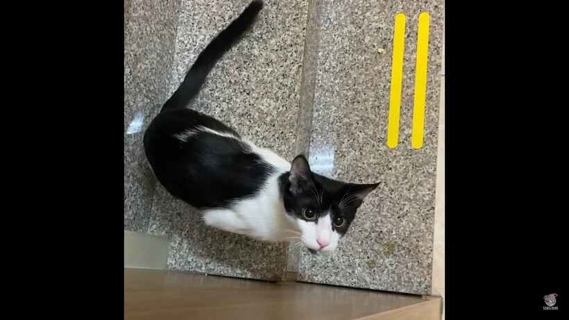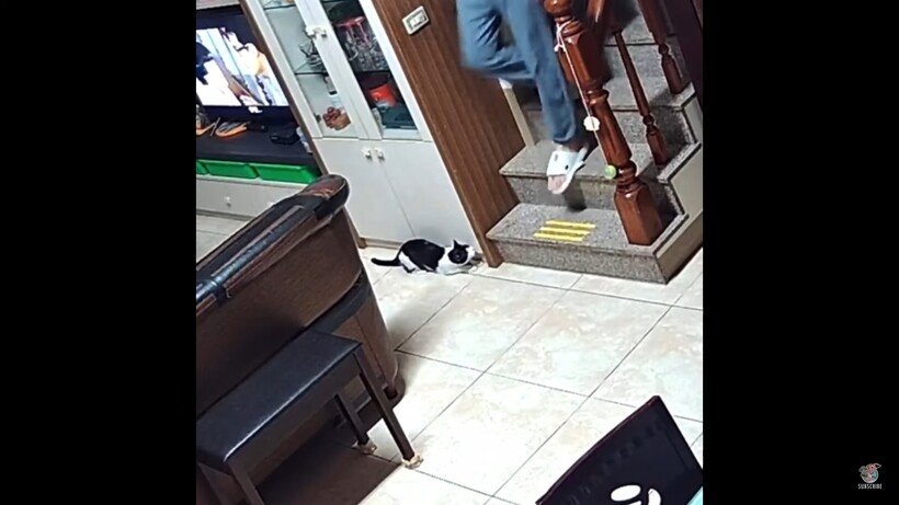 Видео, снятое на скрытую камеру, начинается с того, что кот ждет того, кто спустится по лестнице. Он затаился за углом и ожидает игры. А когда пожилой человек спускается, он с радостью нападает на него. Затем черно-белого озорника решили снять от первого лица. Кот опять выглядывает с шаловливой мордашкой и милыми огромными зелеными глазами. Это видео было снято в городе Гаосюн в Тайване. Оно набрало уже тысячи просмотров и много восторженных комментариев. В этом материале мы рассказывали, как кот играет с дельфинами.