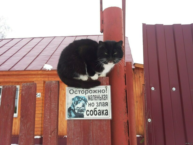 Как часто, проходя мимо частных домов или любой другой чужой собственности со своей огороженной территорией, можно увидеть висящую на заборе табличку «Осторожно, злая собака». Прочитав это предупреждение, и мысли не возникнет даже просто заглянуть за калитку. Однако нередко такие предостерегающие таблички не имеют ничего общего с реальностью, и за забором скрывается наимилейший пес, а то и вовсе другой зверь. В этом материале мы собрали несколько фото ну очень «злых» охранников.