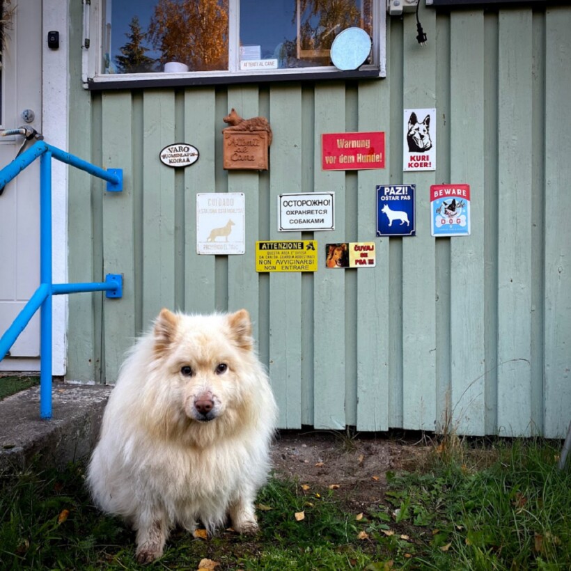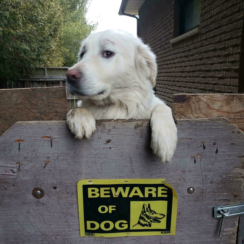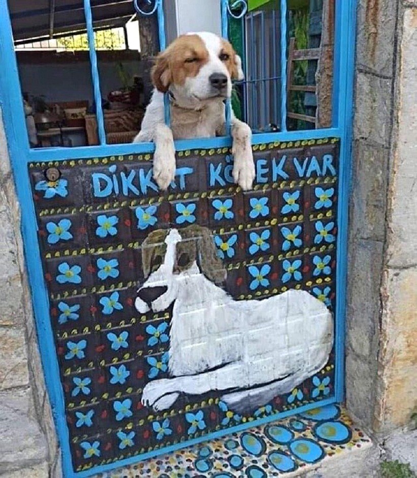 Хозяин этого «грозного» пса привозит ему из поездок в разные города и страны таблички с надписью «Остерегайтесь собаки»