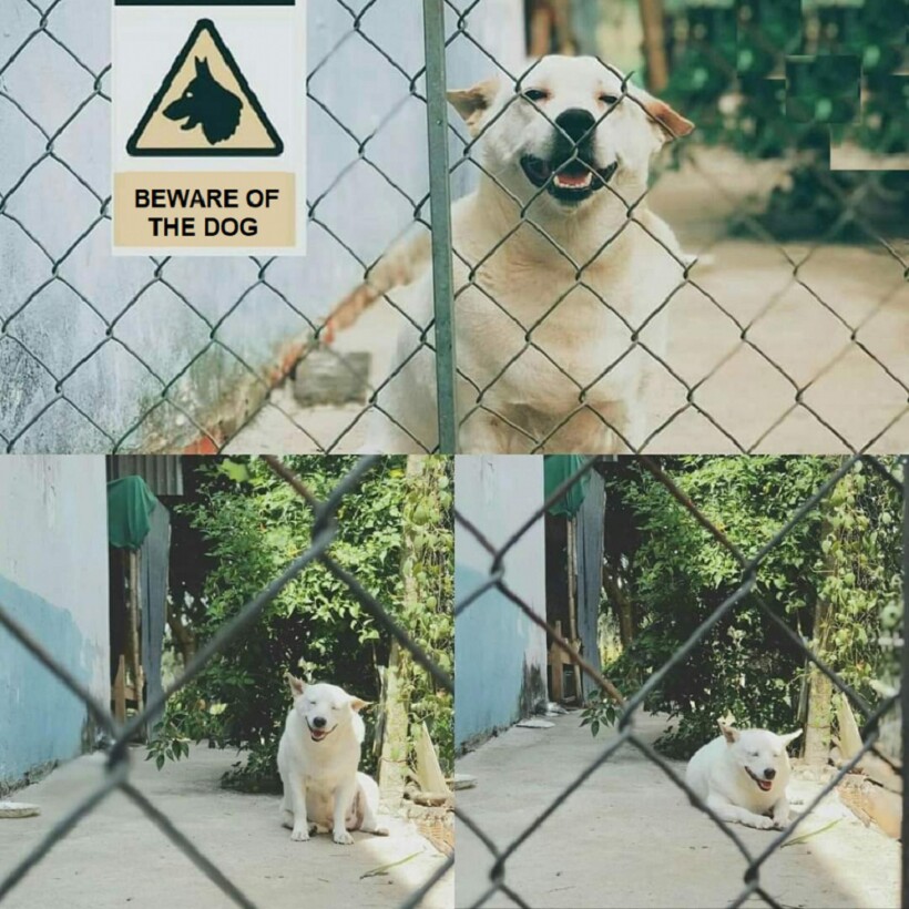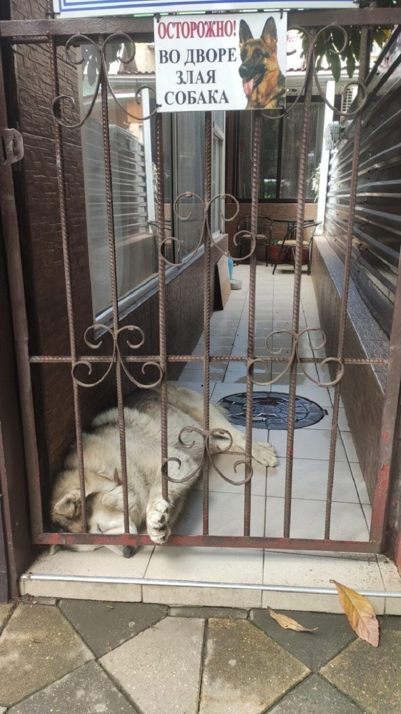 «Читай, что на этой табличке написано. Я — злой. Но если у тебя есть косточка, колбаса или котлета, то можешь меня погладить»