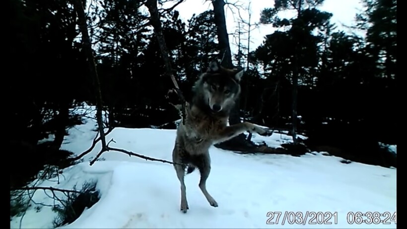 В лесу кто-то решил закрепить скрытую камеру, и ничего бы, возможно, не случилось, если бы она не попала на глаза одному веселому волку. Видео начинается с того, что животное проходит мимо фотоловушки и не замечает ее. Но позже хищник замечает камеру и резко выпрыгивает на нее. Видно, что у него игривое настроение, ведь он скачет, нападает и кривит морду. Затем волк отдыхает тоже прямо перед видеокамерой, будто ему нравится находиться в кадре. Здесь можно узнать, почему волки не выступают в цирках.