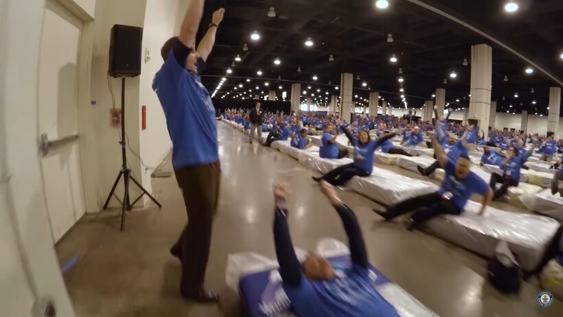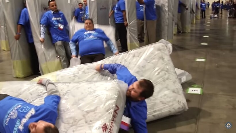 Что вы будете делать, когда у вас есть 1200 человек, столько же матрасов и 6500 квадратных метров пространства? Вы побьете мировой рекорд Гиннесса! Американская компания Aaron's Inc., которая занимается продажей бытовой техники и мебели, побила мировой рекорд по величине «человеческого домино» с матрасами. Это случилось в рамках ежегодной встречи менеджеров компании. Все получилось с первой попытки, и на ее завершение ушло тринадцать с половиной минут. Люди в голубых футболках побили рекорд 2012 года. И это у них получилось сделать почти так же эффектно, как здесь у настоящих костяшек домино.