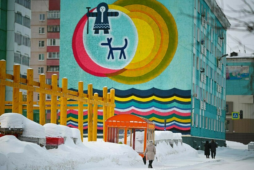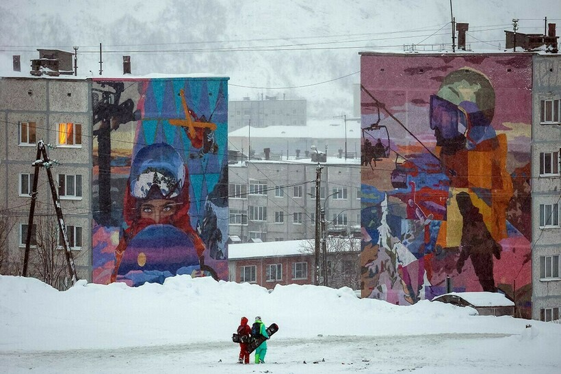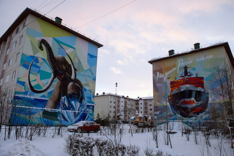 Воодушевившись северной стилизацией, Норильск и Дудинка украсили свои дома арктическими фресками. Здесь есть и совы, и собаки, и олени, и играющие дети.