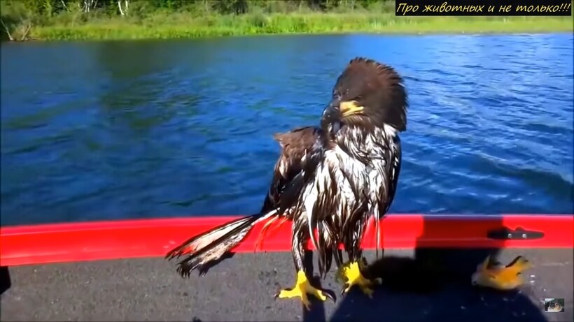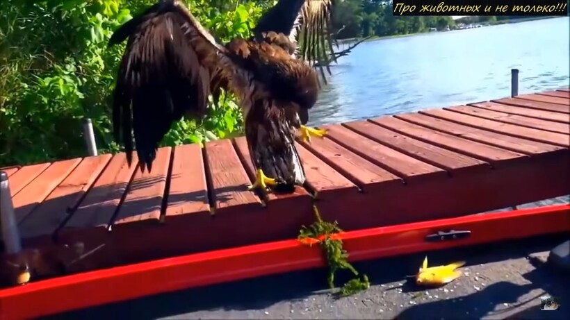 Крылатый герой видеоролика не умел плавать, но есть орлы, которые умеют. Это лысые орлы, которых многие знают как белоголовых орланов. Эти птицы селятся вблизи водоемов и нередко выходят не только на охоту, но и на рыбалку. Если пойманная рыба оказывается слишком большой, то они ее тянут к берегу, загребая крыльями.