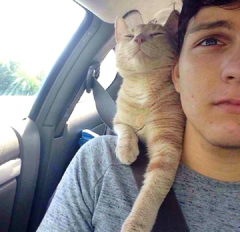 Кот обожает ездить со своим новым хозяином на автомобиле